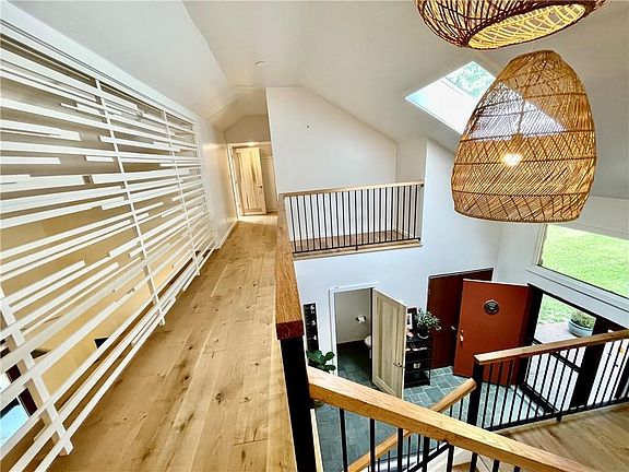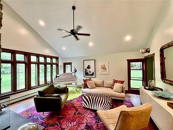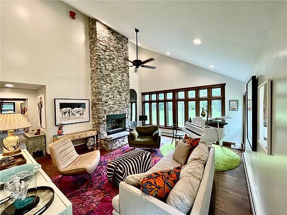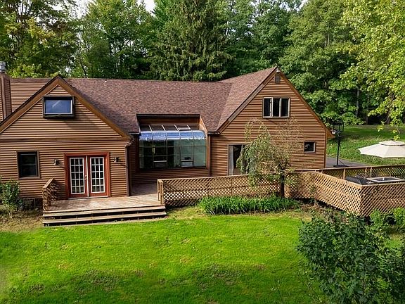 Tucked away on a secluded 11.68 acres w/wildlife galore, stream, pond & pole barn. Too many updates to list. Custom design work throughout. 2 way fieldstone fireplace between vaulted living room and bright craft/art studio area, heated kitchen floors and a stove that's a must see! Owner's suite and laundry on first floor. Second floor features 3 large bright bedrooms. One with its own climbing wall! @ more baths and a large storage area. Stamped concrete patio & huge deck wired for a hot tub.