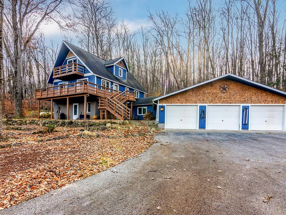 This property offers 2.75 acres of land, complemented by a spacious four-bedroom, three-bath chalet and an oversized three-car garage just a few minutes from town and year-round recreation. You’ll appreciate recent updates that include updated lighting, refrigerator, mother of pearl backsplash, luxury vinyl plank flooring, and reverse osmosis filtration for both the refrigerator and cold-water tap. On the main floor there is a welcoming great room, with a natural stone fireplace & access to a wrap-around deck. The island kitchen offers ample space for preparing meals for gatherings. The laundry is conveniently located on the main level, along with a bedroom and a full bath for ease of daily living. Upstairs, you will find two additional bedrooms share a full bath. The lower level serves as a complete separate living or guest suite, featuring a bedroom or office, a 3/4 bath, a second full kitchen, and a family room with wood stove—accessible from an exterior entrance and suitable for use as a game room or extra living space. The expansive garage accommodates multiple vehicles and equipment and includes a wood stove for heating. The generous yard ensures privacy, and the fenced garden area will enable you to test your green thumb. An additional garden building provides space for storage or may serve as a chicken coup. The property is conveniently located just minutes from the charming village of Bellaire, Shanty Creek Resort, the Cedar River and some of the region’s finest lakes and trails.
