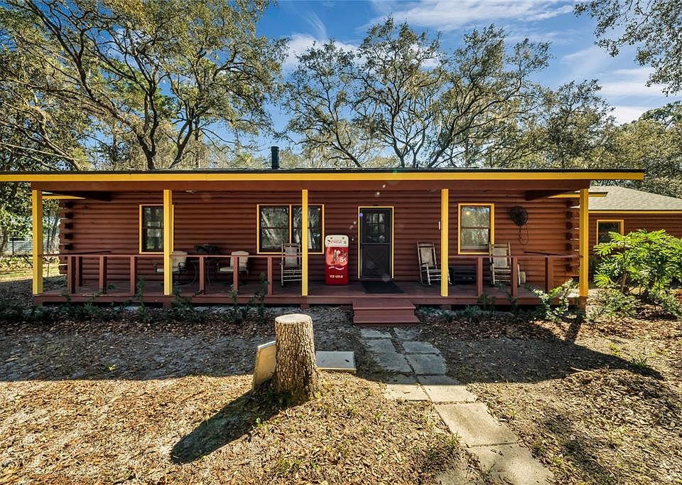 One or more photo(s) has been virtually staged. A TRULY UNIQUE ESTATE! Welcome to this exquisite 3-bedroom, 2-bathroom log cabin that radiates warmth and charm! It’s not just a house; it's an experience waiting to unfold. Right away, you will notice the 1.3 acres are fully fenced, with a private gate and a large front porch to take in the dreamy views of the Live Oak trees surrounding the property. The large, open living and dining area welcomes you with a vaulted ceiling and a wood-burning stove, perfect for cozy evenings with loved ones. You will even find a bonus room that expands the living space and provides access to the backyard. The kitchen, features solid wood cabinetry, a pantry closet, and an expansive walk-in pantry for all your storage needs. The spacious primary bedroom boasts an en-suite bathroom, dual sinks, and a walk-in closet. Enjoy an indoor laundry room to top of the list of conveniences in this one of a kind property. In addition to the two car garage, there are 2 large storage sheds currently used as workshops, one even has a concrete pad for boat storage. NEW ROOF in 2020 and elevated land that sits high and dry ensures worry-free living, making this property a sound investment. Embrace the serenity of rural living while still being a mere 12 minutes away from DeLeon Springs State Park and Downtown Deland. Plus, enjoy the luxury of being only 35 minutes from the sunny shores of Daytona Beach. Don't miss the chance to make this unique property your own – where every day feels like a retreat and city conveniences are just a short drive away. Schedule your viewing today!