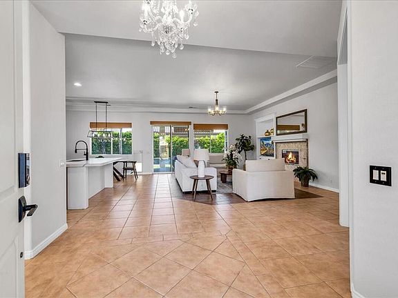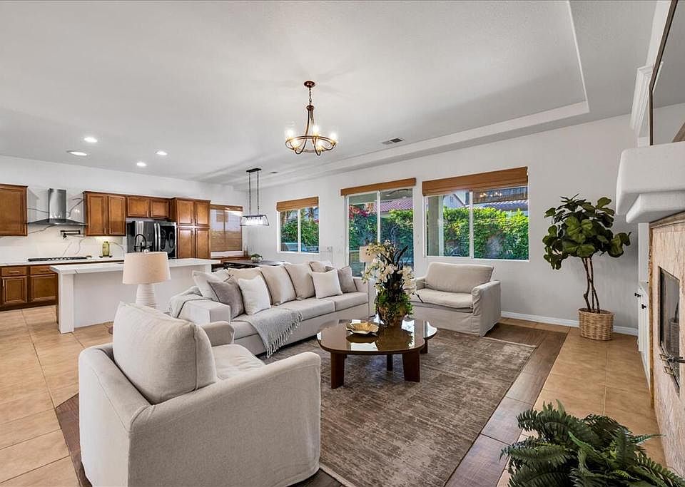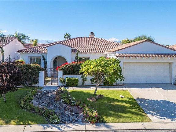 Welcome to your desert dream home in the highly sought-after gated community of La Quinta Del Oro, located just across Washington Street from the world-renowned Indian Wells Tennis Garden. This beautifully updated 3 bed, 3 bath home with a den/office offers 2,443 sq ft of stylish open-concept living. The gourmet kitchen has been upgraded with quartz slab countertops, stainless steel appliances, custom backsplash and an eat-at island--ideal for both cooking and entertaining. The kitchen flows seamlessly into the spacious family room with a cozy fireplace and a dining area that opens to your own resort-style west-facing backyard. Step outside to enjoy a saltwater pool, covered outdoor kitchen, seating area, and lush artificial turf for easy maintenance and eco-conscious living. The large front courtyard is perfect for relaxing and enjoying morning sunrises. Interior and exterior were freshly painted in 2022, and the home features a ChargePoint EV charger, automatic doggie door, ceiling fans, and stylish fixtures throughout. With 10' ceilings, 8' doors, and elegant arched doorways, the architectural details elevate the space. Close to shopping, dining, hiking, golf, pickleball, and more. Friendly neighbors and a warm community vibe make this house a home. Low HOA fees. This is a must-see!