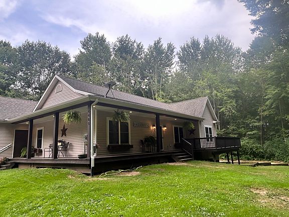Experience this impressive custom-built 4-bed, 2-bath home, perfectly situated on 5.3 acres of serene, private land. Tucked away 300 feet from the road in a beautiful wooded setting, offering an incredible blend of modern elegance & natural beauty. It's covered porch, expansive decking, & concrete surround, this home exudes quality & attention to detail. The 90% finished basement adds valuable space & includes a 3rd almost finished bath, making it perfect for gatherings or entertaining. Efficiency is a priority here, featuring spray foam & batt insulation combined with a state-of-the-art geothermal heating and cooling system that ensures remarkably low utility costs throughout the year. Advanced well system provides ample pressure, perfect for an irrigation setup. Also you'll find a large shed equipped with full electrical service, insulation, & heating, along with a luxurious goat shelter & small pasture, ideal for mini goats. Showcases pride of Ownership & meticulous care.