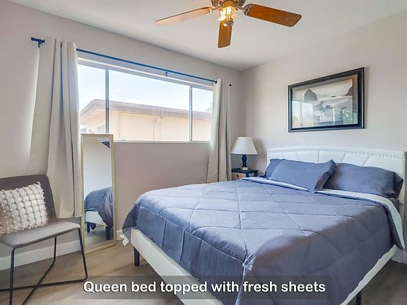 Welcome to this modern 3-bedroom, 1200 sqft home in Chula Vista. Feel at home with assigned parking for 2 cars and enjoy the convenience of being just 5-10 minutes away from shopping centers and local restaurants. The fully equipped kitchen is perfect for culinary enthusiasts, featuring a gas stove and oven, blender, toaster, cooking pans, baking trays, and essential supplies like coffee, oil, sugar, and salt. Modern appliances include a coffee machine, microwave, and fridge. The dining area offers tables and chairs for enjoying your meals. The air-conditioned living area features flat-screen smart TVs with cable and streaming services like Netflix, YouTube, and Disney+, all viewable from comfortable couches. Pets are welcome, and there is dedicated parking for 2 cars conveniently located right in front of the house. Nestled in a peaceful neighborhood, this home is centrally located near shopping centers, local restaurants, Walmart Supercenter, and highways connecting you to all San Diego attractions within minutes. Self-check-in is available via lockbox or keypad, with instructions sent at noon on your check-in day. To avoid noise complaints, please keep noise levels down, especially after 9 PM, and ensure all activities are inside with doors and windows closed. Violations of the noise policy may incur a $1000 penalty. Unauthorized guests or pets will incur a $100 per night penalty. Late checkout without prior approval will be fined twice the nightly rate. Please dispose of trash properly and report any damages immediately. No food is allowed in bedrooms to maintain cleanliness. Please lock all windows and doors when leaving the suite. The home is remote work-friendly, offering a choice of desks and chairs both inside and outside, along with 500Mbps Wi-Fi, making it easy to host online meetings or share large files.