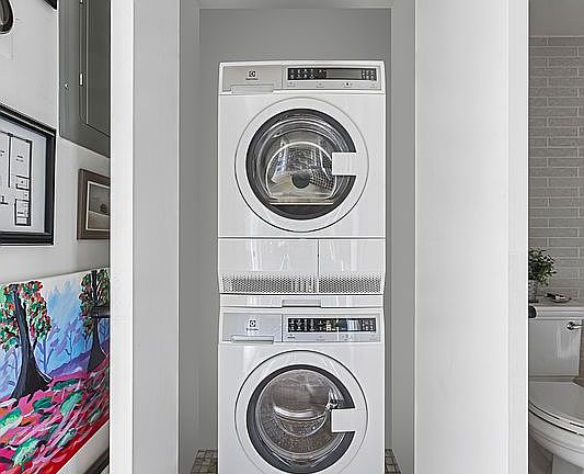In the bathroom, Riobel, Grohe, and Kohler fixtures pair beautifully with patterned tile and custom Spanish vanities, while the deep-soaking tub and Maax shower create a serene, spa-like retreat. A Bosch washer and dryer are conveniently tucked away in the unit’s laundry closet.