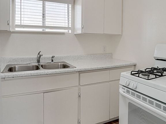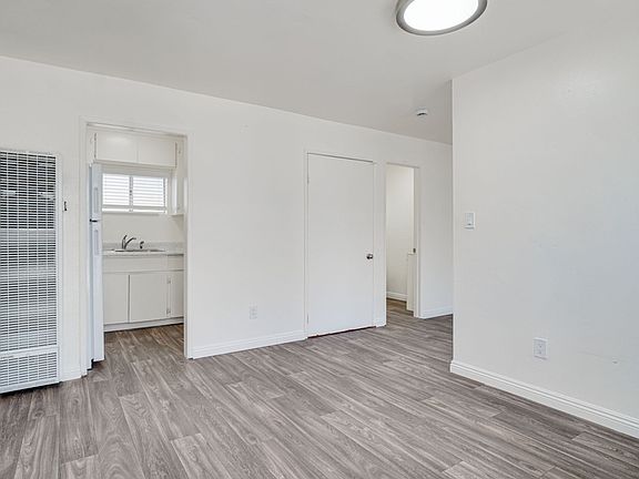 New flooringNew plank flooringExtra shelving in showerNew appliancesSpacious remodeled studioNew white kitchen cabinetsMirrored closet doors
