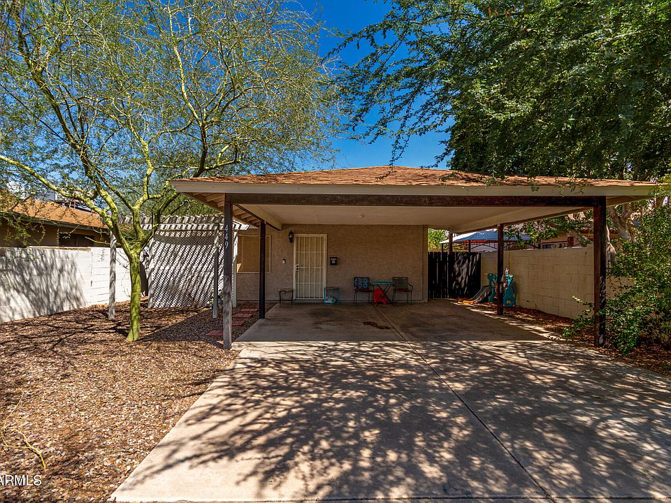 Nestled in the heart of Mesa, this character-filled 3-bedroom, 2-bath gem that blends classic charm with modern touches. The galley-style kitchen features sleek granite countertops, crisp shaker cabinets, and a cozy eat-in nook perfect for morning coffee or casual dinners. The spacious master suite offers a walk-in closet and a private full bath for added comfort. Outside, a 2-car carport provides convenient covered parking, while mature trees surround the property, offering shade and a sense of serenity. The backyard is a blank canvas, with a storage shed, and plenty of potential for custom landscaping, gardening, or outdoor entertaining. With no HOA, you'll enjoy the freedom to personalize your home and outdoor space without added restrictions.
