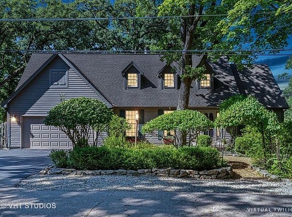 Welcome to 449 Roslyn Road, a welcoming Cape Cod home situated in the picturesque area of Lakewood Estates in East Dundee. The home is nestled on a unique wooded-lot which provides a tranquil & relaxing lifestyle. This expansive residence offers 5 bedrooms and 3 bathrooms across 3,896 square feet, all set on a lush 16,510 square foot lot that provides stunning treehouse views throughout the home and numerous outdoor living spaces! Enjoy the beautiful hardwood floors on the main and 2nd level and a state-of-the-art speaker system is seamlessly integrated throughout, allowing you to enjoy your favorite music in every corner of the home. Upon entering, you'll be captivated by the open-concept living space, highlighted by a vaulted ceiling with 3 upper windows, a charming custom double-sided fireplace for cozy nights and duel staircases leading to two separate upper levels. The living area flows effortlessly into the kitchen/dining room where the other side of the fireplace is exposed and a sunroom, both featuring floor-to-ceiling windows that overlook the serene wooded surroundings. On both sides of the sunroom you will find 2 outside balconies...one with stairs leading down into the backyard oasis and the other is located off of the master bedroom. The kitchen has lots of natural light with windows overlooking the backyard and a skylight. It is filled with plenty of cabinets, a breakfast bar and access to the back deck. An added plus in the kitchen area...there is hardwood flooring under the kitchen cabinets! Adjacent to the kitchen is a large laundry area with direct access to a 2-car garage. The primary suite on the main floor is a true sanctuary, complete with two outdoor seating areas for enjoying the peaceful environment...one overlooking the water fountain in the front yard garden and the other overlooking the backyard. The second floor, accessible via the east staircase, features two additional bedrooms and a full bath, while the west staircase leads to a versatile expansive office space filled with natural light and another skylight. There is plenty of room to spread out or create multiple desk areas. The lower level includes two more bedrooms, a full bath, and access to more outdoor living space...a spacious patio and screened porch, perfect for gatherings or quiet reflection. There is a hook up already in place in the basement to tie into existing fireplace on 1st floor and install fireplace in basement. This property also includes a second attached lot, offering opportunities for expansion or additional outdoor activities such as a pool, playground or open space. Other unique exterior features are a fountain in the front garden along with an antique fence and an a antique brick walkway leading to the front door. There is so much charm to this home...inside and out! The home is walking distance to East Dundee's historic downtown area with parks, restaurants, nightlife and shopping. Embrace the charm and sophistication of 449 Roslyn Road-your elegant oasis awaits! Schedule your visit today!