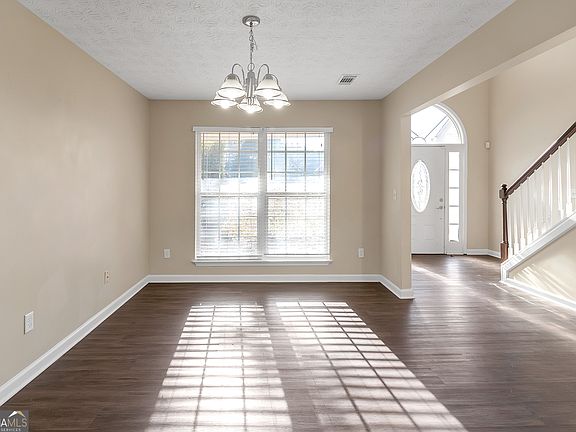 Gorgeous 3 bed, 2.5 bath home in McDonough Georgia that's available for Lease. As soon as you step inside you are greeted by a formal two story foyer with views into the formal dining room. Dark vinyl flooring throughout the home makes it carpet free! Private dining leads to kitchen with stained cabinets, pantry and views into the fireside family room. Family room is two stories with balcony from the second floor looking down. Tons of natural light and large windows overlooking the backyard. Primary suite includes tray ceilings, private bath with walk in closet, separate tub/shower and double vanities. Two more bedrooms make up the second floor and share a full bath. Laundry room on the second floor is an added bonus. Large backyard is flat and grassy with mature trees and patio overlooking it all. Two car garage, long driveway and a swim/tennis HOA make this a can't miss home