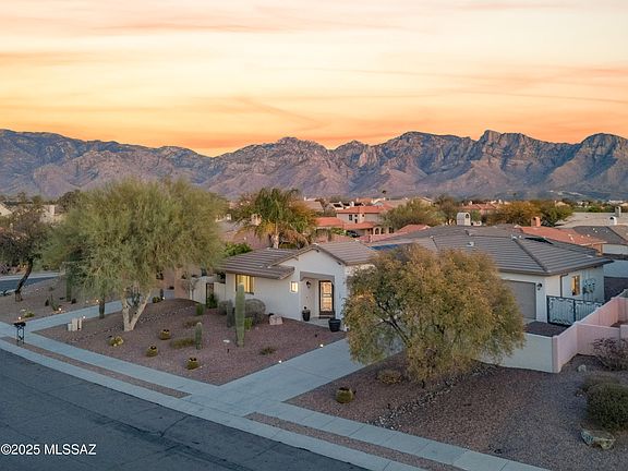 Beautiful Oro Valley home with Pusch Ridge mountain views, owned solar, and an elevated lot offering both privacy and incredible vistas. Built with masonry, block, and steel frame construction, this home features the popular Mosaic floorplan by builder David Baird. Its open-concept design places the spacious kitchen at the heart of the home, featuring granite countertops, stainless steel appliances, gas cooking, and ample storage. Plantation shutters throughout add to the home's timeless appeal. Both primary suites offer direct access to the backyard, and all bathrooms have been tastefully updated. The second primary suite is separately cooled, offering enhanced energy efficiency and comfort for visitors. The elongated driveway features a Porte Cochere, leading you to an oversized, finished two-car garage. The large backyard easily accommodates your guests for the occasional soiree or serves as a relaxed setting in front of a tasteful, enchanting stone outdoor fireplace. With mature fruit trees, brick pavers, and an expansive, wrap-around backyard, this property makes it easy to enjoy our lovely desert climate. Schedule your private showing today to see why so many others are seeking out their next home in Oro Valley!