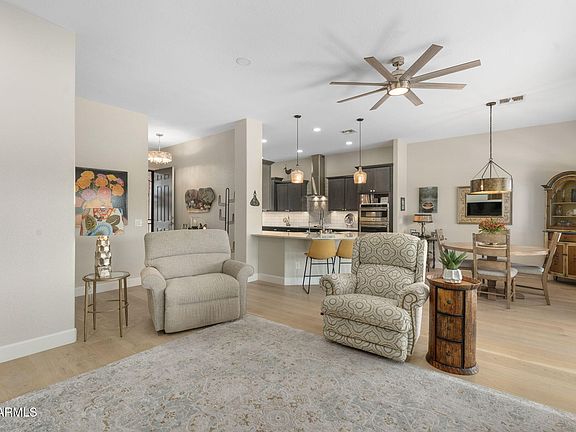 Stunning top to bottom remodel in 2022, turn-key home in sought after 55+ community. Home overlooking golf course w/ salt water pool. Engineered hardwood floors throughout. New cabinetry throughout kitchen, baths, & laundry. Kitchen has quartz counters, stainless appliances w/ induction cooktop, wall oven, microwave & wine refrigerator. Primary suite w/ private exit to backyard, double sinks, quartz counters, tile step-in shower, recessed medicine cabinets, walk-in closet with high-end organizers. 2nd bedroom has carpet. Office/den off entry. Storage room off 2nd bedroom. Laundry room w/ utility sink & cabinets. Front & backyard both with immaculate landscaping & hardscape lighting. True 3 car garage with built-ins. Roof & A/C new in 2022. Close & do nothing except move your furniture in!