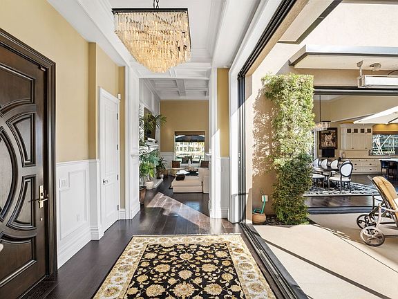 Step into the open-concept living area, where floor-to-ceiling glass windows invite natural light and showcase the picturesque harbor. The kitchen is a chef's dream, adorned with beautiful white cabinetry that perfectly complements the space. The living room features 15-foot ceilings and elegant built-ins flanking the fireplace, adding a touch of sophistication.