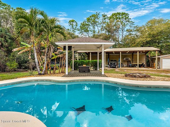 1 ACRE 4/2 POOL HOME W/ ADDITIONAL DETACHED GARAGE AND 30 X 60 POLE BARN GREAT AS WORKSHOP-EXTRA PARKING! Total privacy with property perimeter surrounded by canopy of trees- no immediate neighbors either side. New roof installed 2020, AC unit 2019. This split floor plan features 4 large bedrooms with walk-in closets, energy efficient windows throughout, open vaulted ceilings in main living area and kitchen includes maple cabinets/black stainless steel appliances. Enjoy outdoor living with 2 attached patios in both the front (courtyard) and back of home. Additionally, there is a Pavilion adjacent to the poolside deck. Located in Central Brevard County with a short drive to beaches, shopping, schools. local college and large Space/Tech companies. All information listed in the MLS is intended to be accurate but can not be guaranteed by broker/agent/MLS --