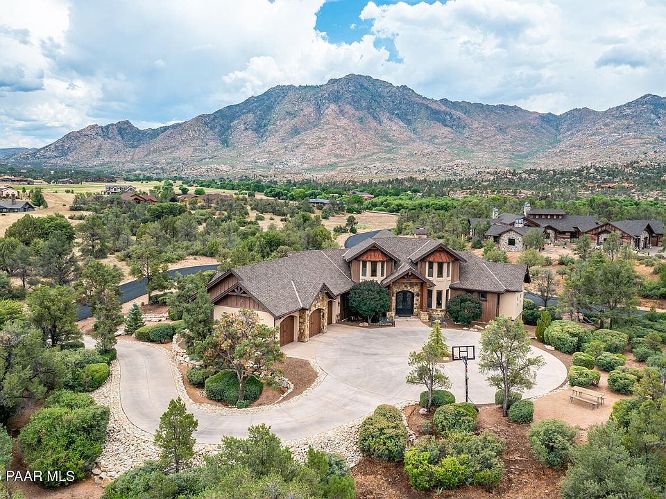 Architecturally timeless estate perfectly sited on a 1.24-acre elevated lot with sweeping views of Granite Mountain. Exquisite design & thoughtful attention to detail throughout this 3,941 sq. ft. architectural masterpiece, offering main level living including 2 bedrooms, 3 baths, office, loft, and open-concept living/dining. Floor to ceiling windows in great room to capture mountain views at all vantage points with wrap around decking. Chef's kitchen features granite counters, commercial-grade range/hood. Primary suite offers see through fireplace to a spa-inspired primary bath with steam shower. Lower level boasts game room, wet bar, media area, 2 bedrooms with ensuite baths, and walk out lower patio. Fully enclosed dog run area off garage. Oversized 3 car garage with plenty of room to add another garage and/or guest house. Estate is walking distance to American Ranch gated community amenities inluding clubhouse with full kitchen, pool, fitness center, billiards, fully stocked fishing lake and mulit-millon dollar equestrian facility offering covered and lighted professional riding arena, outdoor arena, round pen, hotwalker, turn-outs, trail systems and 3 barns offering individual boarding with fully staffed equine care for your horses. Space in barn is based on availability, please verify.