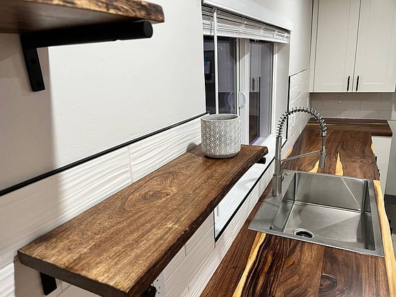 Tons of character with live-edge countertops and decorative shelves and plenty of natural light.