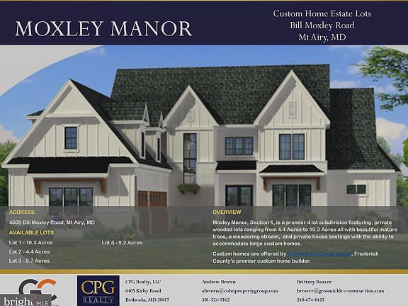 Moxley Manor, Section 1, is a premier 4 lot subdivision featuring private wooded lots ranging from 4.4 acres to 10.3 acres all with beautiful mature trees, a meandering stream, and private house settings. Lot 2 is approximately 4.4 acres and the septic system is approved for a 3 bedroom house. The are protected with a Forest Conservation Easement and have a long private common driveway. Moxley Manor is within the Linganore High School, Windsor Knolls Middle School and Twin Ridge Elementary School systems. House packages are available through Grossnickle Construction but feel free to bring your own builder.