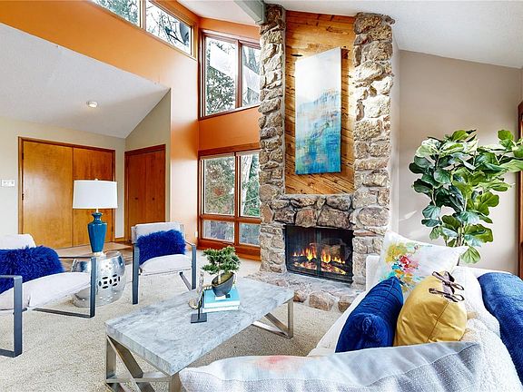 - Description: Stunning Great Room With Vaulted Ceiling, Carpet Flooring, Showcase Windows, And Stone Encased Wood Burning Fireplace.