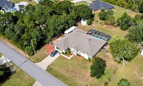 Impeccable! Describes this loved and well maintained 4 Bedrooms, Plus Flex room/Den, 3 full Baths home with a roomy (23' X 25') Garage & a Shed (14' W X 12' L) Situated on a .45 of an acre home site. Open floor plan with tray ceilings throughout. Formal Dining Room. The Kitchen boasts a walk in Pantry, plenty of cabinets, Granite counter tops, unique tiled backsplash, newer Stainless Steel appliances featuring a cooks delight double oven and overlooks the additional spacious everyday, casual eating area. The Great Room opens to the expansive tiled and screened Lanai w/ access to/from the 3rd full Bath. Birdcage screened sparkling in ground salt water Pool overlooks privacy fenced and treed backyard. The Master/Main Suite has door access to/from the Lanai, Spa and Pool. Master Bath has double sink vanities, a corner soaking Tub, a step in tiled Shower and a large closet with built ins. On the opposite side of the home is the hallway with 2 storage closets and the 2nd, 3rd and 4th Bedrooms sharing 2 nicely appointed full Baths. The 3rd Bath has a Walk In Tub and the hall door to the lanai, Spa and Pool. The home has been upgraded and updated over the years and includes; Roof replaced Apr. 2025, Water Heater Jan. 2024, HVAC July 2018. A Home Warranty also conveys with the home. Located in popular SW Ocala neighborhood, close to all your needs and parent popular K-12 schools. Your Oasis awaits!