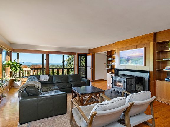 Set on 7.6 private acres with sweeping westerly views, this mid-century modern dream home seamlessly blends timeless design with modern comfort. With 4 bedrooms, 3 baths, and custom built-ins throughout, every inch of this home showcases thoughtful craftsmanship and smart design. The main level features a sun-drenched living room with expansive windows, a cozy wood stove, and extensive built-ins. Head outside onto the spacious wraparound back deck to take in breathtaking views of the foliage. The eat-in kitchen features a bold blue backsplash, under-cabinet lighting, and a dining area with built-in bench seating. Just off the kitchen, a spacious laundry room adds convenience with cabinetry & counter space. The first-floor primary suite is a true retreat with double built-in dressers, dual closets, corner windows framing incredible views, access to the deck and a tiled en-suite bath with a glass-door shower. Also on the main level are a second bedroom, ¾ bath, and an office with custom built-ins. A unique hallway wall of hidden storage adds unexpected charm & function. Upstairs, you'll find two bedrooms, a ¾ bath & cozy reading nook. Outside, the U-shaped driveway provides easy in-and-out access, while the attached 2-car garage and bonus storage shed with a custom wood-burning sauna make outdoor living a dream. Just minutes from schools, shopping, dining, and I-89, this location offers privacy and convenience surrounded by Vermont beauty!
