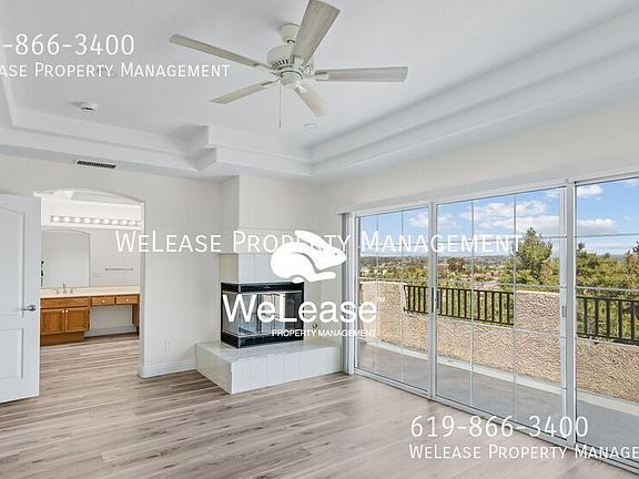The primary suite features: Sliding glass door to a private balcony. Fireplace and ceiling fan. Large walk-in closet. Luxurious bathroom with dual vanities, a walk-in shower, and a jacuzzi-style soaking tub