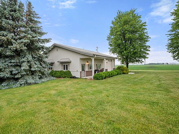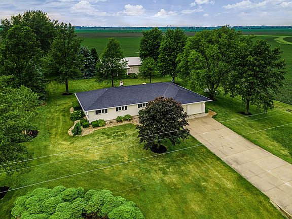Exceptional country setting with 360-degree panoramic views of rural farm America! Enjoy this breathtaking retreat from the newer deck and stamped concrete patio! The stellar 52'x36' outbuilding with covered porch comes equipped with a steel frame and roof, Novabrik (patented mortarless brick siding system), Hardie interior wall paneling, 1/2 bath with Kohler fixtures, 12'x10' overhead door, Pella windows, epoxy floor, Lennox 92.3 energy efficient gas furnace, central air system, tons of overhead lighting, utility sink, illuminated wall sconces, 3-ceiling fans, 4-Bose attached wall speakers, Harley attached wall light, KitchenAid refrigerator and a vacuum cleaner system. Built in 2000, the outbuilding has its own septic system. This custom 2x6 constructed white brick ranch showcases a newly remodeled kitchen in 2018! Luxury furniture grade hickory cabinetry, high-end stainless-steel appliances, stunning tiled backsplash, pantry with pullout drawers, and dovetail soft close drawers accent this favorite gathering room. Attractive pendant lighting and porcelain tile flooring complete this chef's delight gourmet kitchen. The Living Room boasts a corner floor-to-ceiling stone wood burn fireplace with heat venting, Roman window shades and stunning hickory 3/4" wood flooring (new in 2018). There is a den that includes a Browning fire proof safe. The Primary Bedroom Suite presents continued hickory hardwood flooring, premier cherry-wood vanity with Corian solid top, upper cabinets, shower with glass door, walk-in closet, and beautiful travertine tiled flooring... a spa-like retreat! The heart of this lovely home has a warm feel-good vibe with newer light fixtures. The finished lower level features a dry bar with built-in wine rack and 4-stools, pool table, pool table light fixture and accessories, huge Family Room with built-in book shelves, tons of recessed and track lighting, and a convenient 3rd bath with a shower. There are multiple storage rooms, an office, open laundry space with electric dryer and utility sink. A Lennox energy efficient furnace, water softener, humidifier system and storage shelving complete this basement. The owner contracted a new architectural shingled roof in 2021, vinyl clad windows and doors in 2020 & 2021, and new exterior deck in 2021. There is a private well and two septic systems on this property. Rochelle Municipal Utility provides electric service and gas service is provided by propane gas company. A rare real estate offering, make this your new peaceful sanctuary!