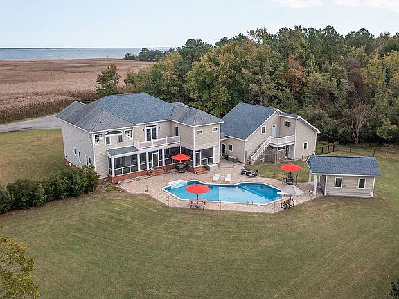 Gorgeous custom built 3,800 SF 4 bedroom 4 bath plus two half baths custom home on one acre in the serene Pungo area of Virginia Beach. This reverse floor plan family home takes advantage of breathtaking views of Red Head Bay and southern Sandbridge, while enjoying cool southern water breezes and star gazing across the marshes and waterways of back bay. Entire interior has fresh paint and first floor has new LVT just installed. Two new water heaters (2021), two Geothermal HVAC units (2010 and 2018). Gourmet kitchen with custom solid wood cabinets, granite, 48” six burner dual fuel (gas top/convection ovens) double range, GE monogram bottom freezer refrigerator, warming drawer, trash compactor, pull out drawers all lower cabinets, two drawer stacks, spice drawer, vertical storage, beverage center and wet bar. Large dining room to enjoy family meals and entertaining guests. Master bedroom with breathtaking views of eastern sunrises on Red Head bay and walk in closet with ample drawers and shelving. Separate his and hers master bath sinks with marble and custom solid wood cabinets, walk in shower and stand-alone water closet. Separate office, wrap around porches, screen in back porch, in ground pool (new liner and pavers 2018) with cabana and fenced yard for year round entertaining. One of the two half baths is located on the screened in back porch for use when entertaining outside. Three car garage with storage for a 20ft boat and ready for a garage apartment/in law suite. Too many amenities to list, must see home! Flexible closing date, buyer agent will be protected. Call now to make this unique property yours!