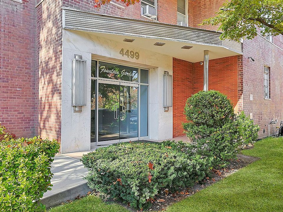 This 1-bedroom, 1-bath apartment is located at Fountain Gardens (4499 Henry Hudson Parkway), a postwar co-op building.