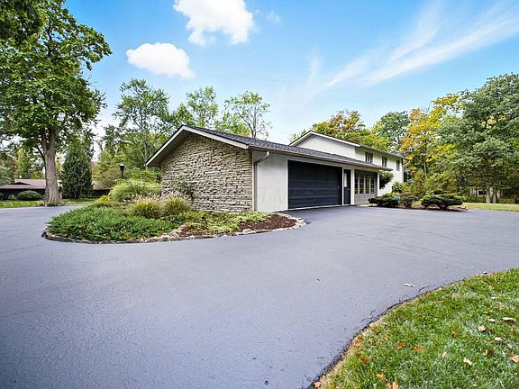 Inspired by Frank Lloyd Wright, this 5 bedroom, 3 full bath home is situated on a rare 1 acre wooded lot in Upper Arlington schools. Capitalize on this unique opportunity to live in one of Upper Arlington's premier neighborhoods characterized by exclusive homes on large lots with mature trees. Upon entry you are greeted by double front doors, vaulted ceilings and mid-century details at every turn with trapezoidal transom window, backlit stained glass panels and a floor-to-ceiling wrought iron partition. Large living room featuring wood burning fireplace flanked by double windows. Decorative glass panels separate living from dining that offers views of the backyard. Adjacent kitchen with white cabinetry, granite counters and stainless appliances has eat-in breakfast nook, walk-in pantry and built-in desk. Upstairs features primary suite with outdoor balcony, plus 3 additional bedrooms and a shared bath. The lower levels have two large living spaces, 2nd fireplace, wet bar, laundry, home office, 5th bedroom, 3rd full bath and significant storage space. An enclosed breezeway connects the house and the oversized 2-car garage and could be used for mudroom, exercise or be converted to a 3rd car garage. Retreat to the multi-level deck or multiple patios surrounded by nature, lush landscape and mature trees that provide shade and privacy. Expansive circular driveway with ample off-street parking. This home is an entertainer's dream with plenty of space both inside and out. Roof (2022), Hot Water Heater (2020). See A2A.