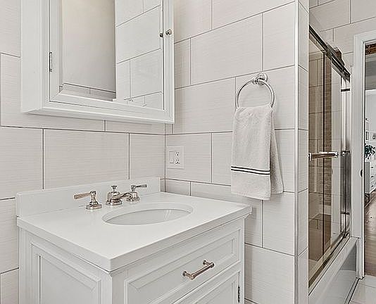 The primary bedroom boasts custom California Closets, providing ample storage and organization. The secondary bedroom features two additional custom closets with more incredible storage. The spacious renovated bathroom is complete with a soaking tub and a window for natural light and ventilation.