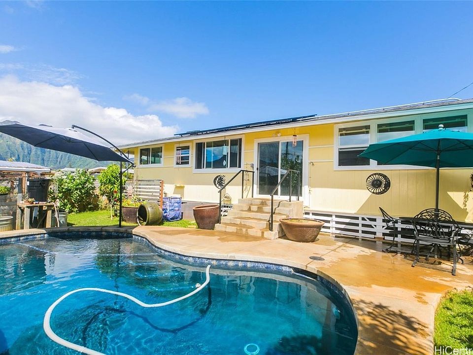 Enjoy grand views of the Koolau mountain range while relaxing in your inviting saltwater pool. This home is tastefully renovated with new kitchen cabinets and lovely appliances which include Bosch Dishwasher, KitchenAid Induction cooktop, in wall oven & microwave, Whirlpool Refrigerator & LG stacked front loading Washer/Dryer. An energy efficient system includes a Sunrun leased PV system with 10 panels, 1 battery and solar. HD waterproof luxury vinyl plank flooring in kitchen & bathrooms, colorful interior custom paint, recessed lighting, ceiling fans in each room to circulate the local breezes and new double pane vinyl windows throughout. Located on a private road at the end of a cul-de-sac near Kaneohe Bay. Tandem parking for up to 3 cars and available street parking. A green house & planting beds are ready for your gardening pleasures.