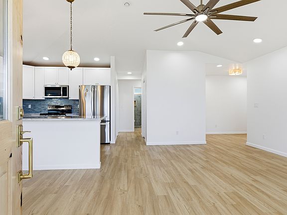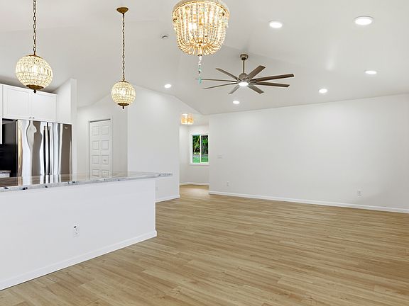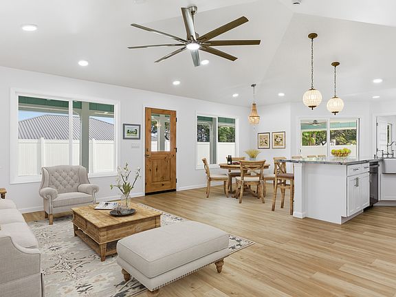 This beautifully designed single-family home blends timeless style with modern comfort, offering an open-concept layout and beach-inspired colors and finishes. Step into a light-filled living space with vaulted ceilings and LVP flooring that flows gracefully from room to room. The kitchen features quartzite countertops, brass hardware, vintage-style knobs and pulls, curated lighting, and a spacious pantry. A wood bead chandelier, hand-strung with beach glass, glass beads, and shells, adds a graceful island touch to the dining area.
