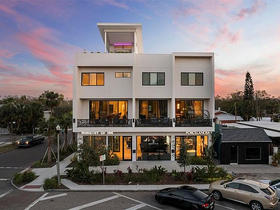 Welcome to an unparalleled urban oasis in St. Petersburg, FL. This 4,800 sq. ft. this Tribeca-style loft condominium offers three bedrooms, three full bathrooms, and two half bathrooms, including a separate ADU ideal for guests or a home office. This new construction home was built in 2024 by MTBH Studios, St Pete's premier modern luxury design team and builder. The entire home comes optionally immaculately furnished with curated furniture and walls decorated with works from local artists. Immerse yourself in a world of luxury and sophistication, where soaring 30 ft ceilings flood the space with abundant light, creating art gallery-quality environments. High-end finishes grace every corner, from Porcelanosa countertops to elegant bathrooms, all centered around a cozy fireplace that exudes modern charm. The gourmet kitchen features a Gaggenau appliance suite with a induction range with downdraft vent, double steam oven, speed oven, microwave/convection combo oven, dishwasher, and paneled fridge and freezer. Private 2nd floor balcony off the living room overlooks Central Avenues live oak trees, fabulous restaurants like Baba, Wildchild, Slim Charmer, and Bandit coffeeshop. The separate third-floor loft media room, complete with a wet bar, wine fridge, surround sound, and half bathroom, is perfect for entertaining and stunning views of downtown St Pete highrises and nearby Tropicana Feild. All 4 floors are accessible by a home elevator that takes you from the garage level up to the roof top. Smart home features include WAC 4" lighting and sound speakers throughout, all easily controlled from your smartphone. Floating stairs lead to a spectacular rooftop retreat , expansive private roof deck, replete with an outdoor kitchen and a platform ready for a soaking tub, all offering panoramic views of St. Pete. With a two-car garage with epoxy floors and a street entrance, this townhome provides both convenience and privacy. Located in the vibrant Grand Central District, you're in the heart of St. Petersburg's best dining, art, music, and entertainment scene, with the Gulf beaches just minutes away. Experience single-family home luxury with the low-maintenance benefits of a condominium and a low HOA. Your sophisticated urban retreat awaits!
