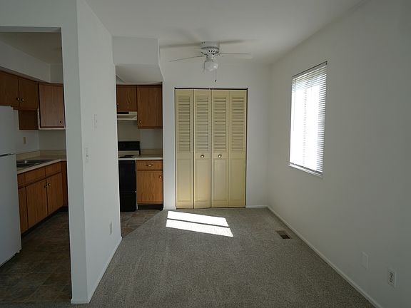The fully equipped kitchen includes a stove, refrigerator, garbage disposal, and pantry, with plenty of storage throughout the apartment. Each unit also offers a private patio with access to the shared fenced courtyard and common green space, perfect for enjoying the outdoors.