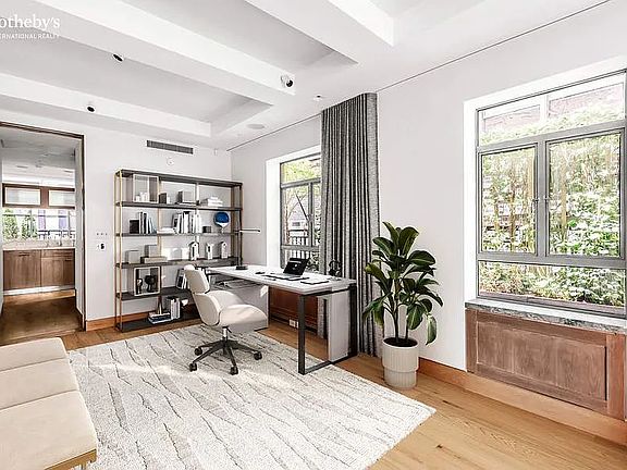 The north-facing primary bedroom and home office are located in a separate wing of the home, accessible through a pocket door that divides the public and private areas. The primary bedroom offers a custom walk-in closet and views of the Crown Building, the top of the Pierre Hotel, and the General Motors building. The ensuite primary bath features a deep soaking tub with white Thassos marble walls and bath slabs and for seasonal comfort, radiant heat floors.