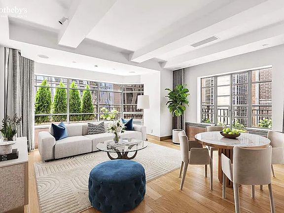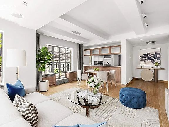 Upon entering this elegant home, one is welcomed by an entry foyer that leads to an inviting living room with a large south-facing bay window and French doors connecting to the terrace. The windowed Chef's kitchen offers a Sub-Zero refrigerator, a Miele speed oven, cooktop and dishwasher with Calcutta Gold marble countertops, and custom cabinetry. A powder room with radiant heat flooring is conveniently located off the kitchen.