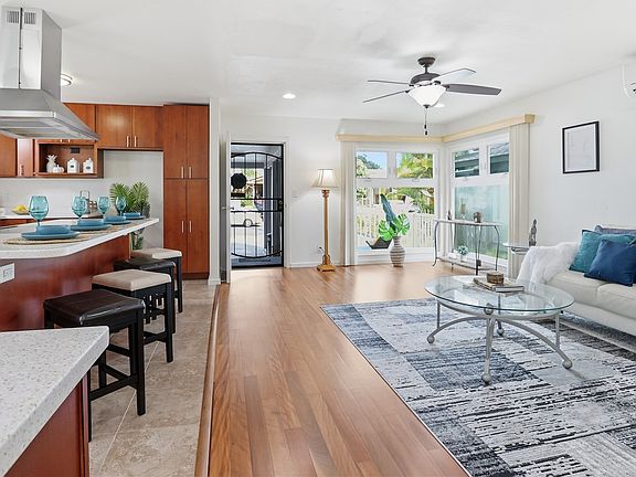 Beautifully updated single-level 3-bedroom, 2-bath home in the heart of Kaneohe! Featuring hardwood and ceramic tile flooring, updated kitchen and baths. Enjoy year-round comfort with split A/C, 19 owned PV panels, and a Tesla Powerwall for energy efficiency and peace of mind. The open kitchen includes warm wood cabinetry, solid-surface countertops, and a spacious island that adds extra seating and counter space-perfect for gatherings or entertaining. Step outside to the backyard with fruit trees including mango, Tahitian lime, calamansi, Hawaiian vi, and guava and a peaceful stream. Additional features include an alarm system, new storage shed, and a 2-car carport with driveway parking for 4 cars or 2 cars and a boat. Conveniently located near Windward Mall, Windward City Shopping Center, restaurants, grocery stores, and Kaneohe Bay. No HOA fees or restrictions-just easy island living at its best!