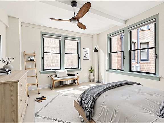 The corner bedroom is a private sanctuary, framed by four windows that welcome sun and sky from multiple exposures. With a generous closet and ample space for a home office, it blends functionality and retreat-like tranquility. The renovated bath pays homage to the building’s period character while offering contemporary comfort, finished with classic subway tile, marble floors, and top-tier Lefroy Brooks fixtures and fittings.