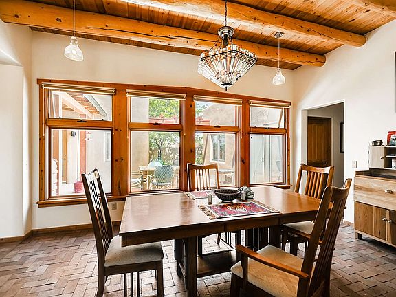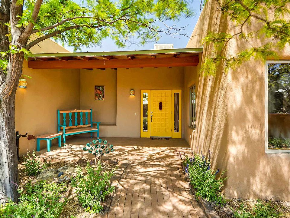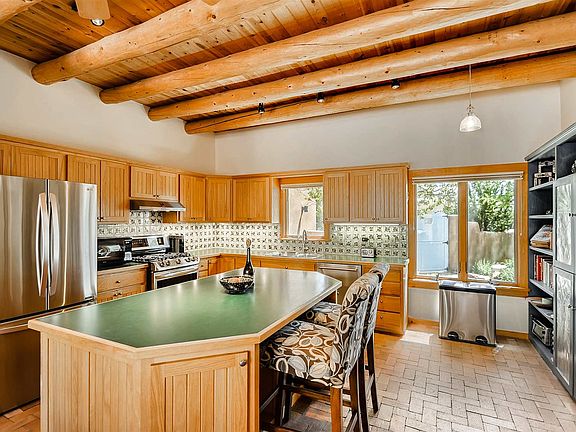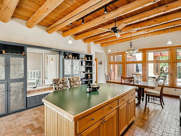 Rarely does a great room of this size become available. More than 600 sq ft with a stunning fireplace, high viga ceilings and outdoor access. Mountain views from this prime greenbelt location. Three outdoor areas include front and back walled courtyards and a Trex deck from living room and master. Spacious eat-in kitchen with island, storage galore and new stainless steel appliances. The guest wing has two bedrooms and full bath. New Silicone roof in 2017 with 10-year transferable warranty. Two-car garage with 3rd bay for workshop or studio space. Additional separate 20 x 20 studio space with good storage. Generous laundry room with custom cabinetry, sink and drying rack. Dog fencing in place. Private well. NO STEPS.