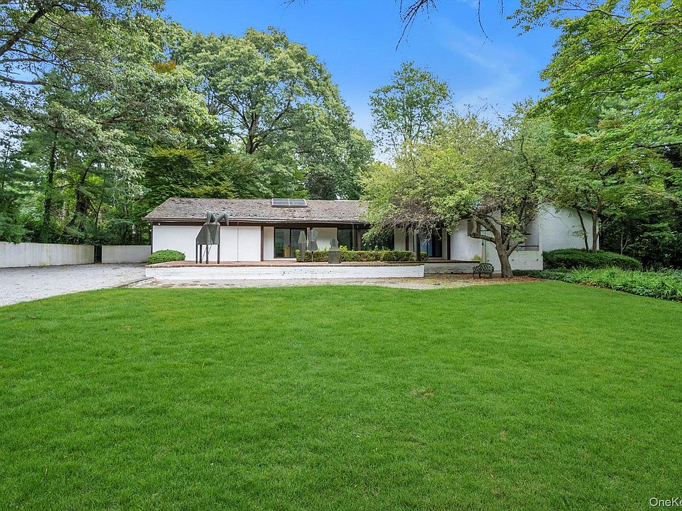 Sophisticated, private and park like, this Sands Point estate set on 3.152 meticulously landscaped acres is a rare jewel. The original ranch style home was built and designed in 1962 by architect Debora Reiser, well known for bringing Long Island modernism into the 21st century. As a practitioner, Reiser was known for working across scales, oscillating between architecture, interiors, and furniture design. Her work was sought after by many high-profile clients. The 3,122 square foot home, still occupied by the original owners, sits at the end of a long winding private driveway and is waiting for your personal touch. As guests arrive at the main entrance, they are greeted by custom designed sculptures. The glass paneled front door gives a sneak peek into the homes open floor plan and backyard through the wall of glass that makes up the entire back of the house. The living room, formal dining room, back den and powder room are flanked by the primary bedroom with en-suite bathroom, home office and two additional bedrooms with full bathroom on one side of the home. The kitchen, another bedroom and full bathroom are on the other side. Two car attached garage, full walk out basement and Gunite pool. Adding to the estates appeal, there is a charming garden cottage with heat and running water which ensures ample space for a workspace and or storage. This extraordinary property is like no other, blending the historic beauty of Sands Point with modern refinement.