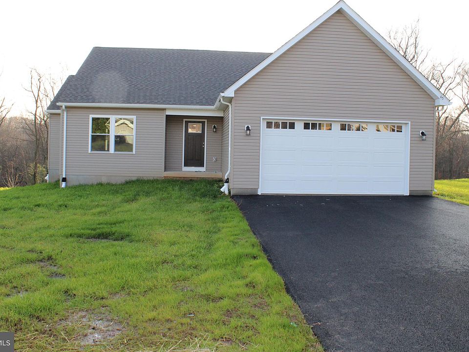 New construction Rancher for easy one floor living could be yours! Open concept floor plan ushers you to a light filled living space. Kitchen offers a center island with a dining area for easy entertaining. A foyer entrance invites you to a spacious living/family space with glass sliding doors that lead you to an outside deck area. The outside deck overlooks a serene, wooded view which is quiet and peaceful. Owner's suite has 2 large windows, a large walk-in closet, and an ensuite bath. The ensuite bath has a tub/shower and double vanity sink. There are 2 additional bedrooms, each with large closets and ample windows allowing in lots of natural light. The center hall bath has tub/shower, single vanity sink, and large linen closet. Laundry area is conveniently located across from the owner's suite. Huge, full, walk-out basement is ready for you to finish to your liking. Two-car garage with paved driveway. Beautiful and bucolic, this new home is ready for you!