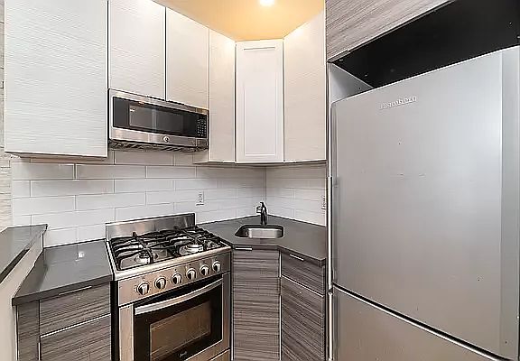 This home offers an open kitchen with full-size stainless steel appliances, hardwood floors, high ceilings, and a modern glass shower. Situated on the first floor of a building with a voice intercom system and an elevator, you'll also find a laundromat just half a block away on Carmine Street.
