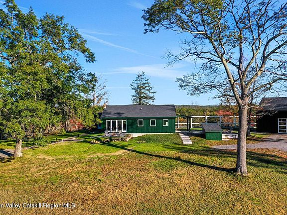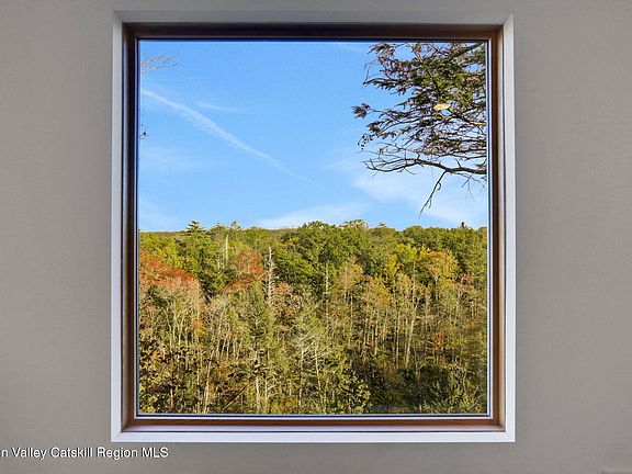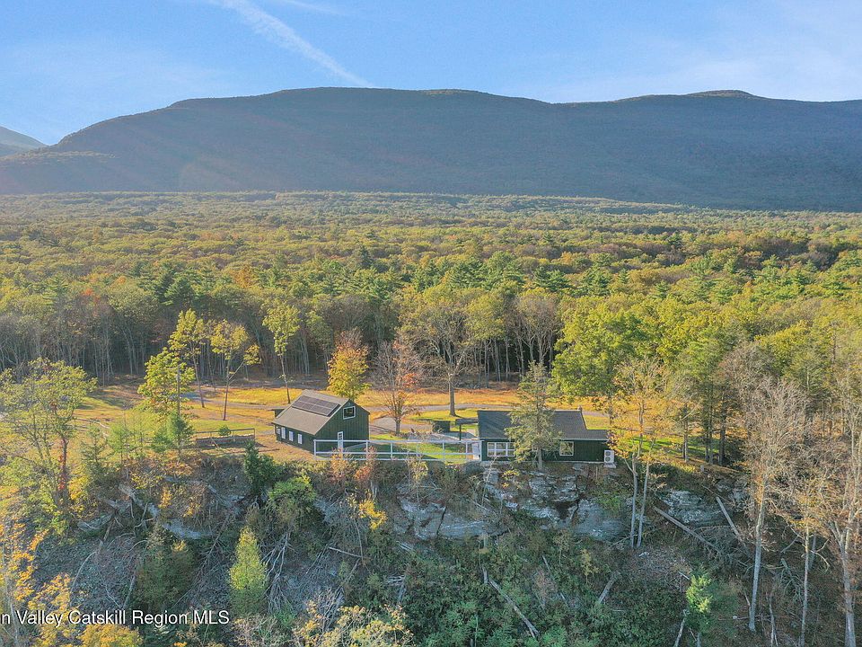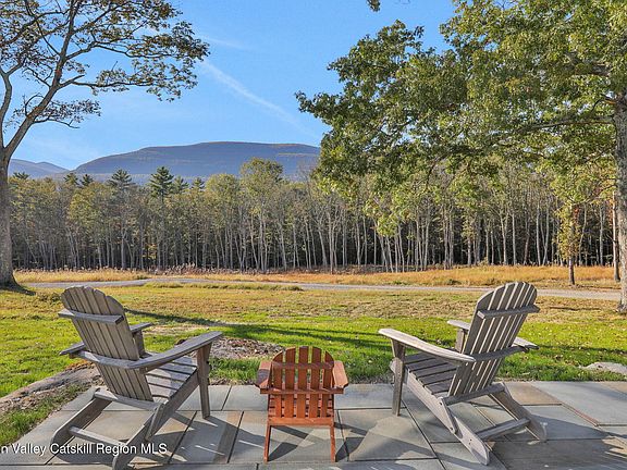 The detached two-car garage—with walk-up attic studio, full bath with heated floor, solar panels, and EV charging station—offers generous space for creative work or more. Thoughtful land clearing opens the views while preserving a picturesque meadow and circular drive. Bluestone patios, a fire pit, and playground invite time outdoors, and a seasonal stream meanders through the woods below. High on a rock outcropping this property feels on top of the world.
