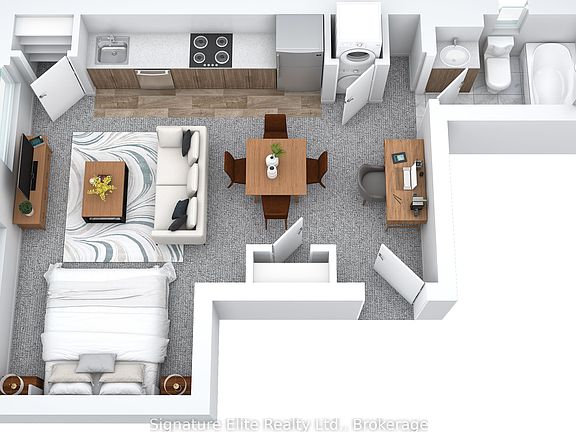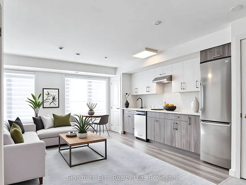 Bright studio suiteOpen-concept layoutModern kitchenStainless steel appliancesTiled backsplashEnsuite laundry