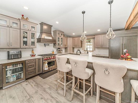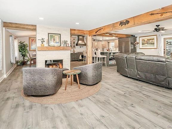 Inside: Fully renovated (2021-2022) with an open floor plan, porcelain wood-look radiant heat floors, natural-cut wood beams, and a 360° white brick propane fireplace. Gourmet kitchen includes Wolf 36" 6-burner stove, 42" paneled Subzero fridge, Sharp drawer microwave, Bosch dishwasher, wine cooler, quartz countertops, subway backsplash, and dual sinks (farm + vegetable). First-floor guest bedrooms and full rustic-style bath.