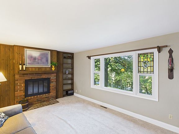 Wood-burning fireplaceFinished basementFirst-floor primary suiteSurrounded by mature treesBrick homeVisiting wildlifeOversized two-car garage