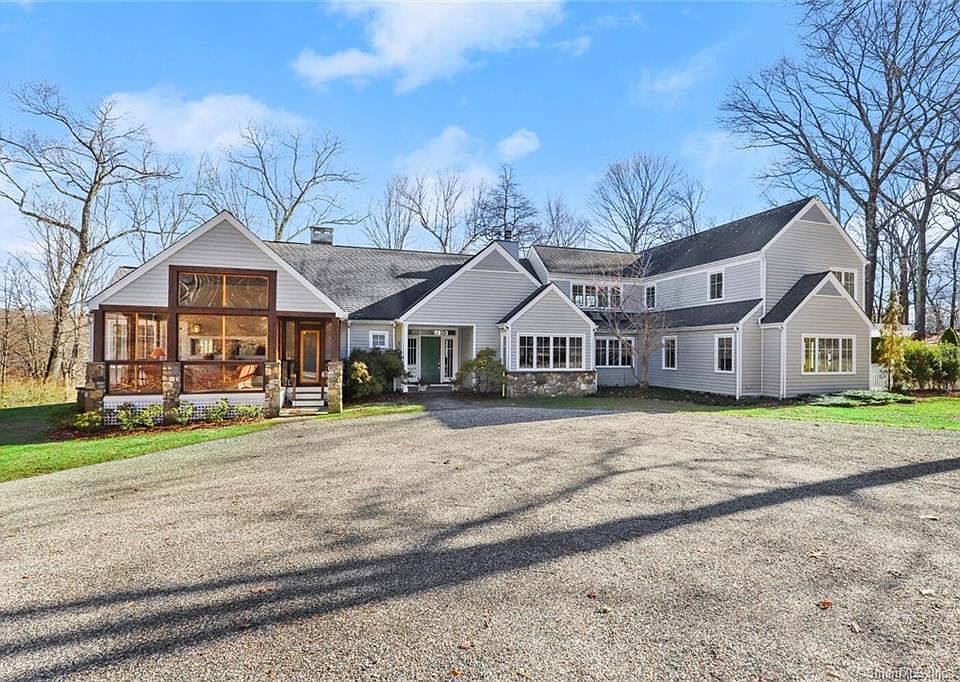 Sited on 9.84 acres. This beautiful Contemporary home has been rebuilt and expanded. Interior and exterior stone detailing; designed by architect George Henschel of Bedford Village, NY (2000 rebuild); kitchen designed by Joeb Moore & Associates of Greenwich, CT and built by Prutting & Co. (2013 kitchen renovation); detached garage/office/potting shed, designed by Teo Siguenza of Bedford Village and build by Andrade Construction of Danbury, CT (2022). Luxury two bay garage (2022). Entry hall; powder room; Large eat-in kitchen high-end appliances; double-height dining room with WBF, oak built-ins; double-height living room with Wood burning fireplace; study (possible extra bedroom) with gas fireplace; first floor primary bedroom suite with French doors; his/hers bathrooms, and 2 walk-in closets; exercise room/laundry; access to bluestone patios from all of French doors. Sun room. 3-season cedar porch with custom-built screens and plexiglass windows. Cathedral ceilings. Garage includes heated and air-conditioned office and powder room, with room to expand to full bathroom; potting shed, and Level 2 EV charger. Custom cabinets throughout the home. Custom windows. Professionally designed landscaping including stone walls, mature trees and gardens. Four bedroom septic allows opportunity for further expansion. The house was designed to echo the rock outcroppings and mature trees found on the property. The oversized windows and transoms provide a view of the gardens and woodlands. The house is great for both large-scale and intimate entertaining. Above all, it is a tranquil and very private retreat. A short walk to hiking trails and across from Pound Ridge Land Conservancy preserves. 18kW Generac generator with 500 gallon propane tank. 19-zone irrigation system. Convenient to downtown shops, restaurants, Inn of Pound Ridge quick access to RT. 684, Ridgefield, New Canaan. Location, location, location. A detailed list of improvements is available. Taxes do not reflect any STAR rebate or exemptions.