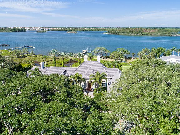 WATCH VIDEO : (Living Room and Kitchen 3D renderings are for marketing purposes only to show potential updates). Nestled along a private stretch of the Indian River, this desirable 4BR/5.5BA waterfront retreat showcases one of the most breathtaking, panoramic Intracoastal Waterway views with nearly 180 feet of direct river frontage. Sited on a gracious 1.49+/- acre homesite on a coveted tree-canopied street, this impressive home greets you with a stately great room with fireplace, custom built-ins, two wet bars, natural stone detailing, architectural columns and graceful arches. The vaulted ceiling family room with fireplace opens to the large center island eat-in kitchen, with gorgeous pool and scenic river views beyond. Enjoy brilliant sunsets throughout this 7,027+/- GSF residence offering a lap pool, new boat dock with lift and kayak ramp, handsome library with fireplace, large master suite with luxuriously appointed bathrooms, guest bedroom en suites, bonus office, laundry room and 2-car garage. The lush tropical setting, exceptional architecture and private riverfront location deliver a relaxed sense of elegance and style.