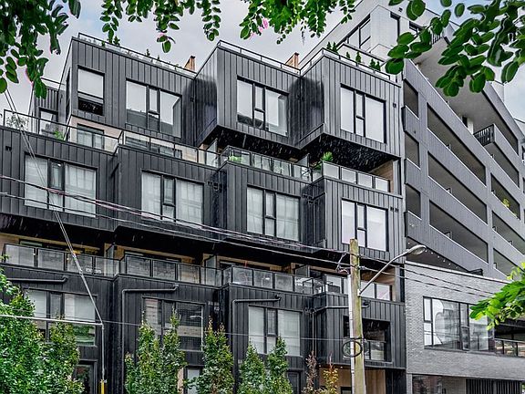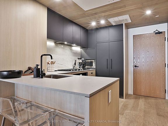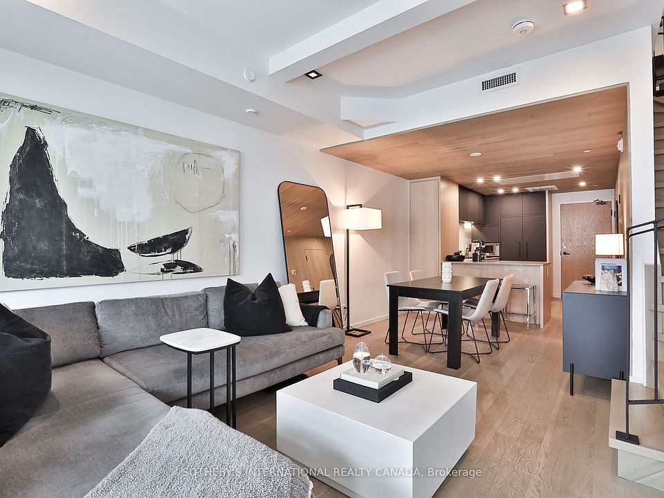 Welcome to Unit 302 at The Cabin Condos, a rare two-storey residence offering over 1,000 sq ft of refined living. Tucked away just off Queen Street West, this unit offers a quiet, design-forward space in the heart of one of Toronto's most vibrant neighbourhood. Boutique building with only 25 units. The main floor boasts a sleek, open-concept layout with stunning wide-plank hardwood floors throughout. Custom kitchen featuring full-sized integrated appliances, gas cooktop, breakfast bar, and upgraded finishes throughout. Two-piece powder room on the main floor. Upstairs, the sun-filled primary bedroom features floor-to-ceiling windows and includes a walk-in closet and spa-like ensuite with an oversized wet room. The oversized den offers flexible space for a second bedroom, home office, or personal gym. A west-facing terrace with a gas line extends your living space outdoors - ideal for summer BBQs. Perfectly located in the heart of Queen West yet quietly set back from the bustle, and just steps to Ossington, Trinity Bellwoods, top restaurants, shopping, and transit.