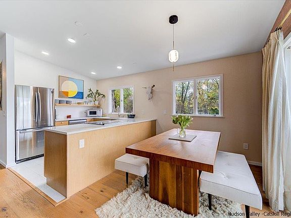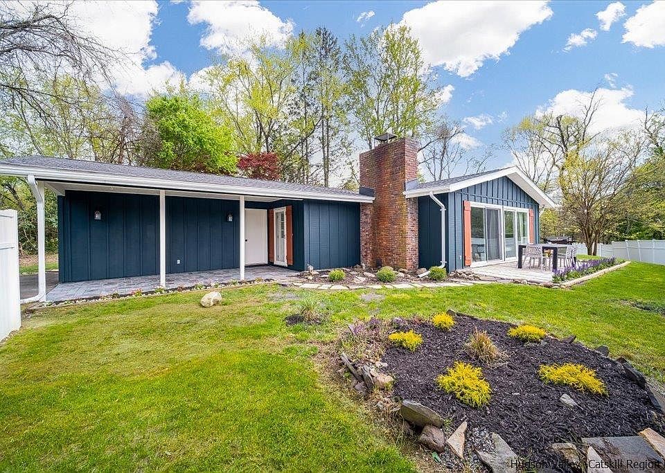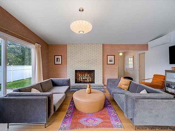 Rare opportunity to own a newly renovated, turn-key, mid-century ranch in the desirable town of Stone Ridge. Situated on a quiet cul-de-sac, this energy efficient home offers light filled indoor/outdoor living. The single story open floor plan boasts cathedral ceilings and oversized windows that capture seasonal views of the Catskill Mountains. The living room is the heart of the home, with a wall of sliding glass doors that open out to a travertine patio perfect for hosting large dinner parties. In winter, stoke the wood fireplace, as you spread out and lounge fireside. The smart chef’s kitchen with quartz countertops and stainless steel induction oven keeps everything within reach. There are three light filled bedrooms with spacious closets. The bathroom, with its beautiful tile work and custom built walnut vanity, has radiant floor heating and a walk-in shower. A smart washer/dryer is tucked in the corner of this efficient bathroom. Store your car and hobby gear in the attached one-car garage. If you need more space the garage can be finished into additional living area. Outside, two patio areas, beautiful landscaping and a lush green grassy backyard make this the ultimate home to enjoy the seasons. Upgrades made in 2022 include a new roof, three heat pumps, septic and leach field making this home perfect for low maintenance living. Conveniently located in the center of prestigious Marbletown and super close to everything you could possibly want to do in the area. The house is just 5 minutes to Main Street in Stone Ridge, 10 minutes to Accord and Kerhonkson, 20 minutes to Kingston and New Paltz, 30 minutes to Rhinebeck and 1.5 hours to NYC.