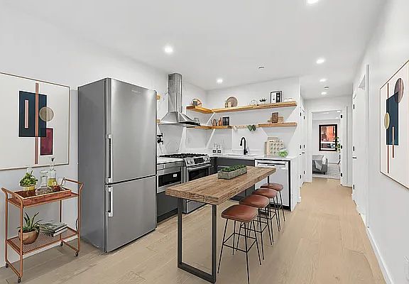 Residence 1 is a ground floor unit, with two bedrooms, two full bathrooms, a home office and an 865sf fenced backyard with a deck. This full floor unit boasts large living spaces and excellent light with Eastern and Western exposures. This apartment has in-unit laundry, central air conditioning, stunning all new Boen 8" wide-plank light oak wood floors and recessed lighting throughout. The kitchen features brand new TOL stainless steel appliances, brushed gold finishes, pot-filler, sleek grey cabinetry with white quartz countertops and natural wood plank shelves. Each apartment in this boutique building comes equipped with digital and keyed entry locks and virtual doorman intercom. For added convenience, each unit also comes with a private 66sf keyed storage room in the basement.