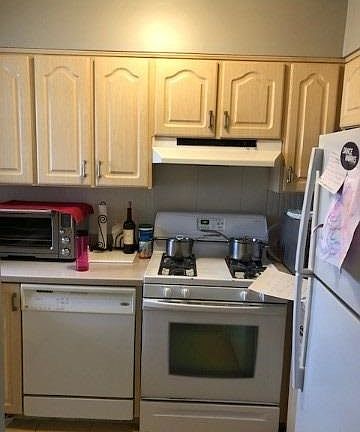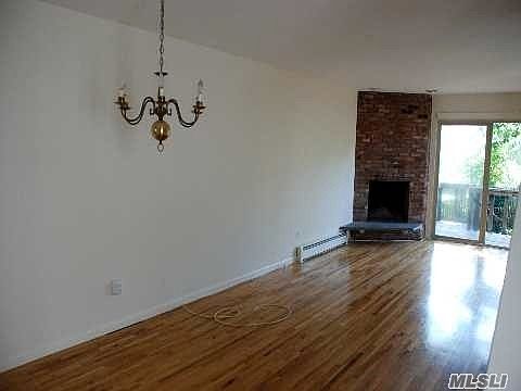 Lovely Duplex apartment featuring living room with fireplace, dining area, wood floors. Sliding doors to wood deck. Updated kitchen, half bath. Second floor has master bedroom w/en suite bath, second bedroom w/en suite bath. This home includes a finished basement with laundry and off street parking.