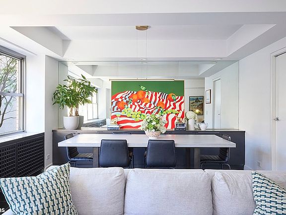 The open living room-dining layout showcases charming views of the surrounding townhouses, mature trees, and verdant gardens through oversized windows spanning 17'6" of the 21' width of the space. The delightful views are on display from the moment one enters the apartment-and NYC landmarks like The Carlyle can even be spotted sparkling at night from the living room windows. A gracious entry leads into a large open living room-dining space that can accommodate sizable gatherings while remaining intimate for cozy days and nights at home. The large kitchen, just off the dining area, is ideal for the casual or serious chef, and features a full-size luxury Fisher and Paykel fridge. The generous corner primary bedroom has dual exposure windows with fantastic townhouse/garden/tree views in both directions. It features a full wall of closets, an additional large walk-in closet upon entry, and a windowed en suite bath. The second bedroom has three closets, a built-in desk and custom bookshelves, and a charming view. The windowed second bath, located off the bedroom hall, also serves as a guest bath and includes a vented stacked washer/dryer. The apartment features recently renovated through-the-wall air conditioning as well as a vast walk-in closet off the bedroom hall, with ample room to store luggage, skis, golf clubs, and bikes. Use of a large storage bin also transfers with the apartment.
